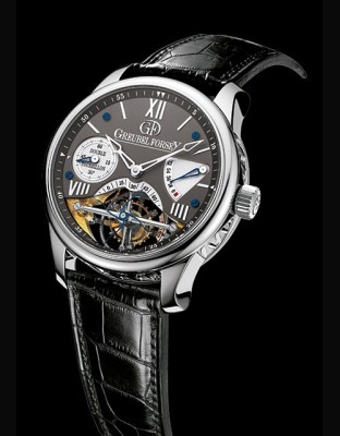 Another exceptional watch with a platine case, signed by both artists watchmakers Robert Greubel and Stephen Forsey. Two double tourbillon cages give it its accuracy at the top.