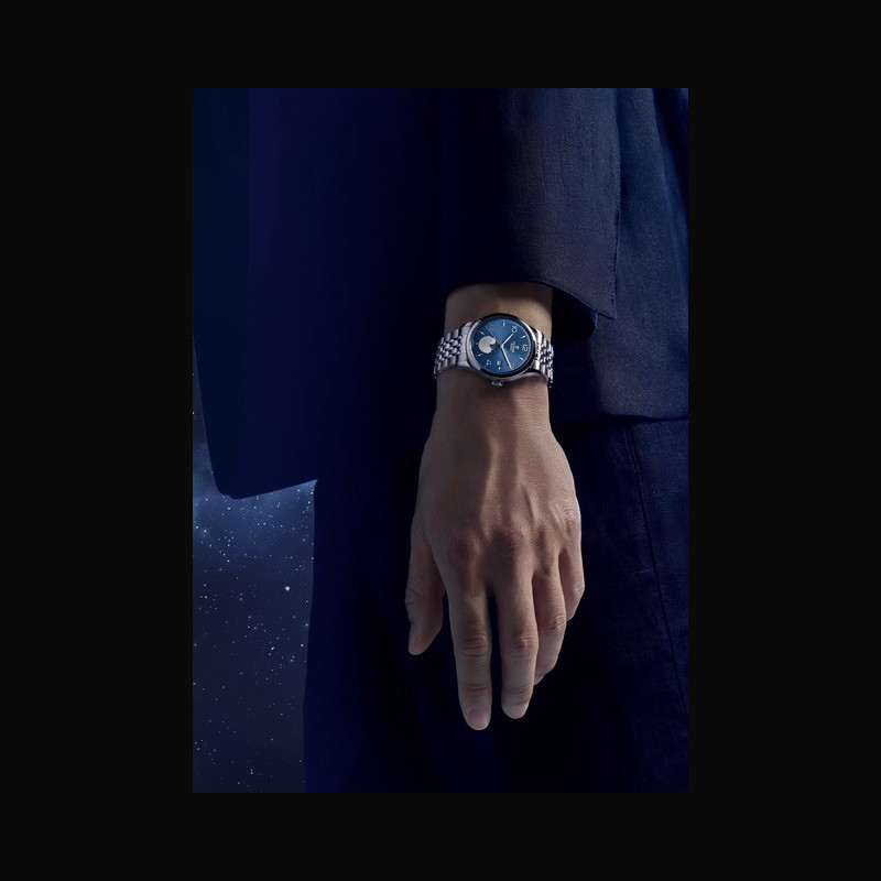 Working with TUDOR’s designers, Jay added his magic to the watch, and the result is as magnificent as a resplendent full moon lighting up the night sky. Framed by a perfectly polished bevel, the moon phase indicator appears at 6 o’clock on three brand new dials in 39mm stainless steel cases for the 1926: Blue, Black and Jay’s own, champagne-colour.