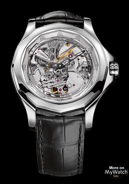 | More characteristics : | Movement Power reserve: 100 hours Frequency: 3 Hz. 21'600 vph Dimension: 14 1/2''' Rubies: 42 Movement finishes: Hand-decorated surfaces CORUM logo engraved on the bridge 4 hammers. 2 chiming at the same time Case Titanium grade 5 Bezel material: Titanium grade 5 Crown material: Titanium grade 5 Engraved CORUM key Crown protector material: Titanium grade 5 Screwed in open back cover in Titanium grade 5 with glare proof saphire crystal Distinctive features Winding bezel (27°) to start the minute repeater function No dial Hourly nautical pennants engraved on he flange Buckle Titanium grade 5 Engraved CORUM logo |