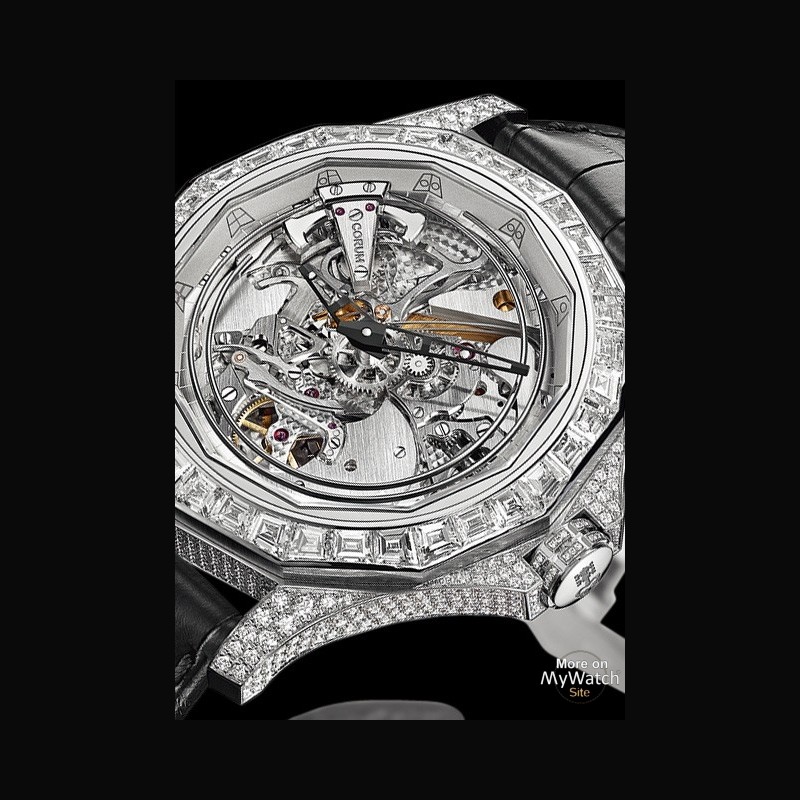 | + More characteristics : | Movement Power reserve: 100 hours Frequency: 3 Hz. 21'600 vph Dimension: 14 1/2''' Rubies: 42 Movement finishes: Hand-decorated surfaces CORUM logo engraved on the bridge 4 hammers. 2 chiming at the same time Case 18kt white gold 542 Round diamonds (~ 3.55 ct) Bezel material: 18kt white gold 36 Baguette diamonds (~ 7.51 ct) Crown material: 18kt white gold Engraved CORUM key Crown protector material: 18kt white gold 48 Round diamonds (~ 0.04 ct) Back type: Screwed in open back cover in 18kt white gold with glare proof saphire crystal Distinctive features Winding bezel (27°) to start the minute repeater function No dial Hourly nautical pennants engraved on he flange Buckle 18kt white gold 24 Round diamonds (~ 0.81 ct) Engraved CORUM logo |