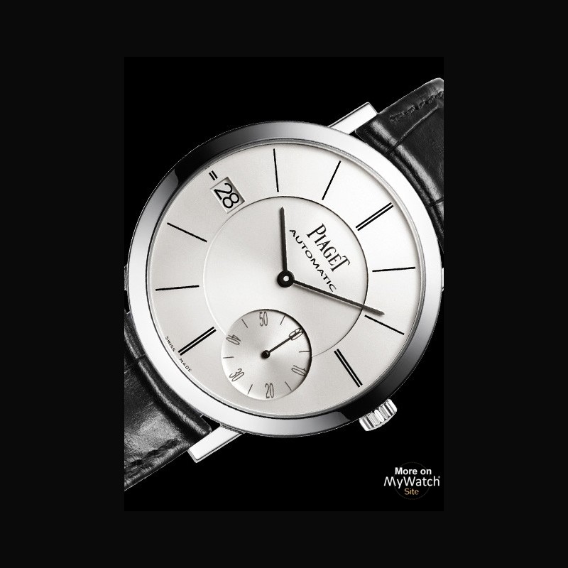 | More characteristics : | Movement Entirely developed. produced. decorated and assembled by Piaget 29.9 mm (13’’’ ¼) x 3 mm Approximately 44-hour power reserve Frequency: 21.600 vph / 3 Hz 221 parts 27 Jewels Circular Côtes de Genève Circular-grained mainplate Beveled bridges Sunray-brushed wheels Blued screws Dedicated index-assembly Rose gold micro-rotor engraved with the Piaget coat of arms Case White gold 18k Strap 18K rose gold pin buckle |