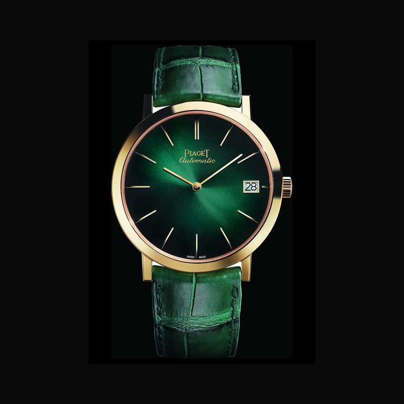 Embedded at the very heart of Piaget’s creative signature characteristics, colour and light naturally find their place within the anniversary collection. The dials with their graded shades radiate an original and refreshing mood entirely attuned to the codes of contemporary elegance. Feminine wrists are thus lit up by a vivid pink subtly transitioning from a more intense to a softer shade, magnificently framed by a case in polished white gold (G0A42109) or diamond-set white gold (G0A42100). At the heart of these two 34 mm-diameter watches beats Calibre 430P (2.1 mm thick), a worthy heir to the hand-wound Piaget 9P movement. The boundless creativity cultivated by Piaget is also confirmed through an irresistible trio of Altiplano 40mm models attired in daring colours. Beautifully accentuated by a white gold case and hour-markers, slate grey takes on various nuances (G0A42050). Midnight blue strikes a beautiful contrast with pink gold and flirts with electric blue (G0A42051), while pine green slides towards emerald green (G0A42052) surrounded by a glowing yellow gold case. To fit neatly inside this 40 mm case, the Manufacture has developed the 1203P movement. Inspired by Calibre 1205P – presented in 2013 as the natural heir to the iconic 12P –, this new self-winding movement picks up the essential elements of time read-off while adding the date. The historical inscription “Piaget Automatique” – which appeared on the very first ultrathin timepieces by the Maison – sets the signature touch to the new trio and honours the line’s rich history.
