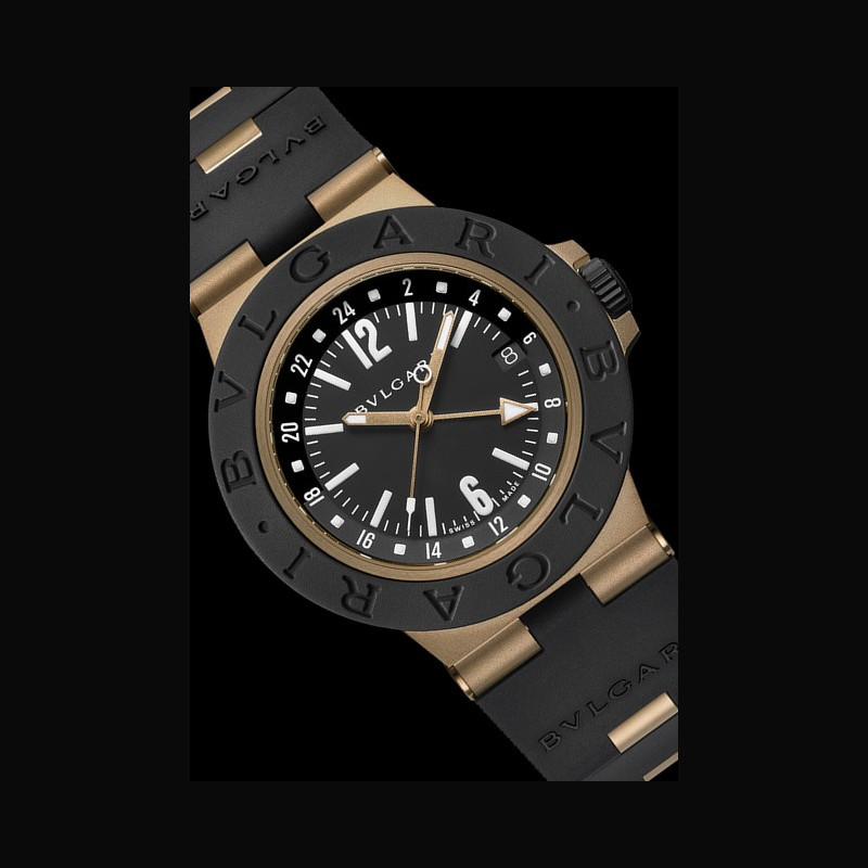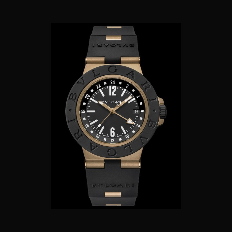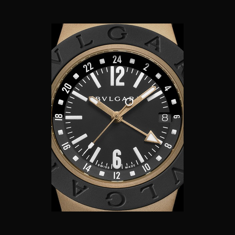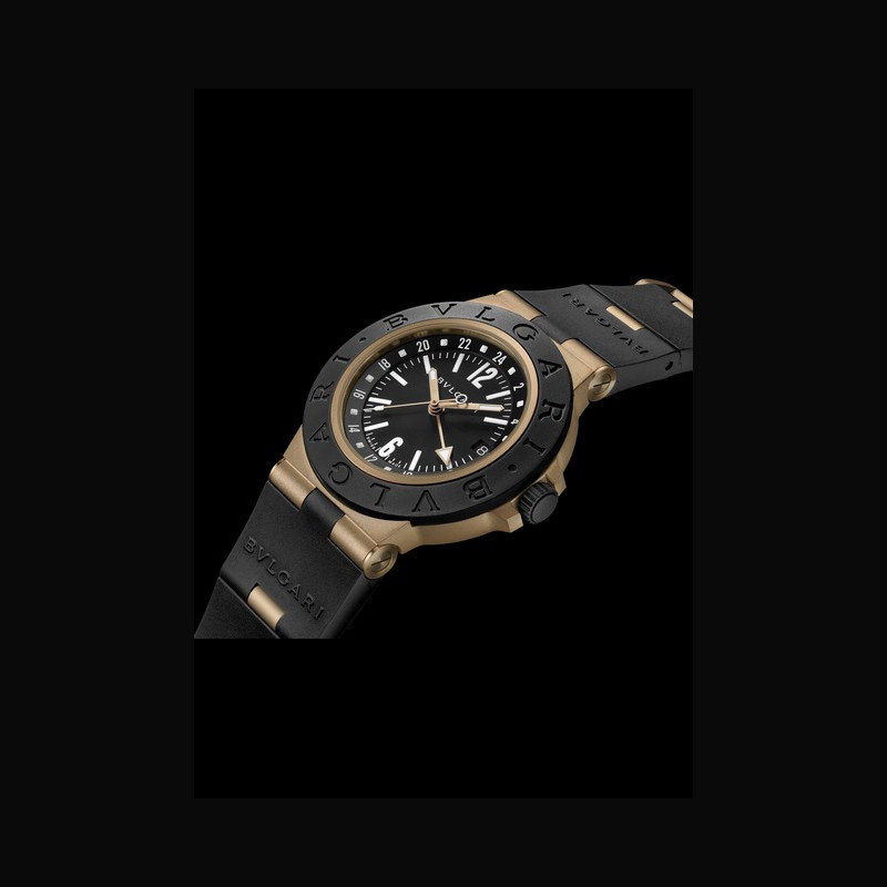 The Bvlgari Bronzo GMT oflers a distinctive, travel-ready interpretation of the dual-time complication. The deep black rubber bezel contrasts with the warm tone of the bronze case, while the black dial is punctuated by rose gold-plated, sandblasted hands for a sharper silhouette. At its centre, the lacquered 24-hour GMT disc in black oflers a clear and intuitive reading of the second time zone. The case’s sandblasted surfaces emphasise both texture and technical precision, while the bracelet continues the dialogue between contrasting materials.