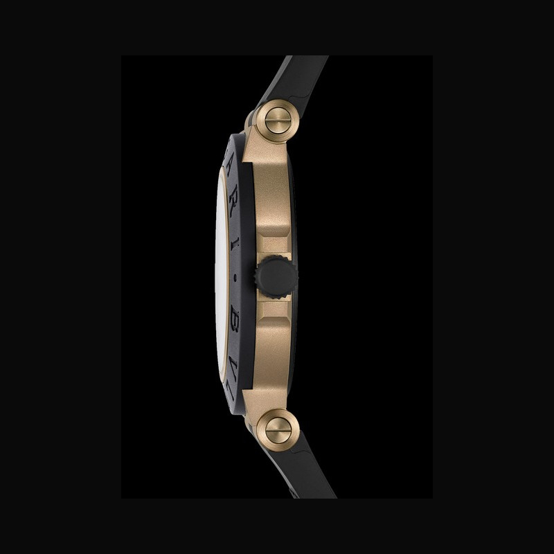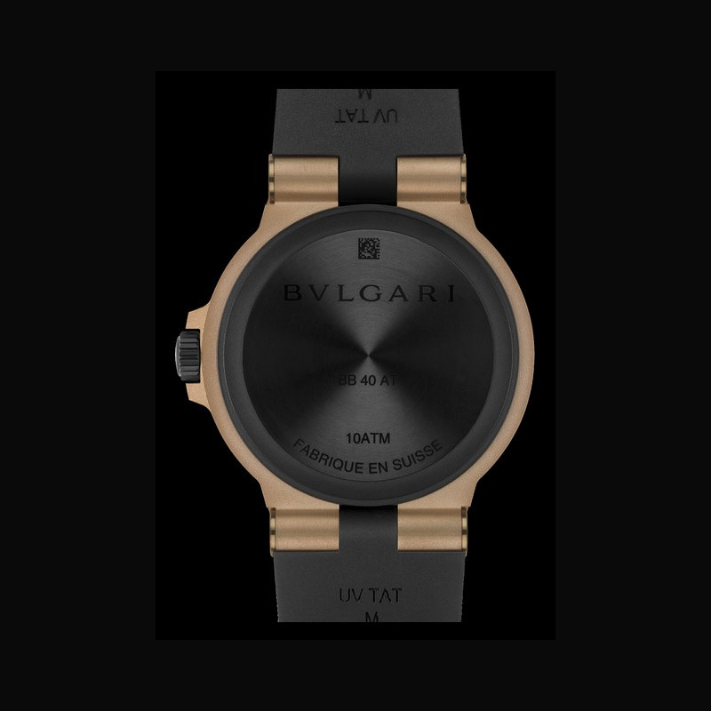 A noble, living metal, bronze gives the Bvlgari Bronzo Chronograph a rare presence, both visually and through its texture. The carefully balanced contrast between sandblasted metal and deep black rubber carries the strength and character of a design that stands the test of time. The warm tones of the alloy play ofl the matte black dial in a bold graphic composition, elevated by azuré counters, a tachymeter scale, and rose gold hands.