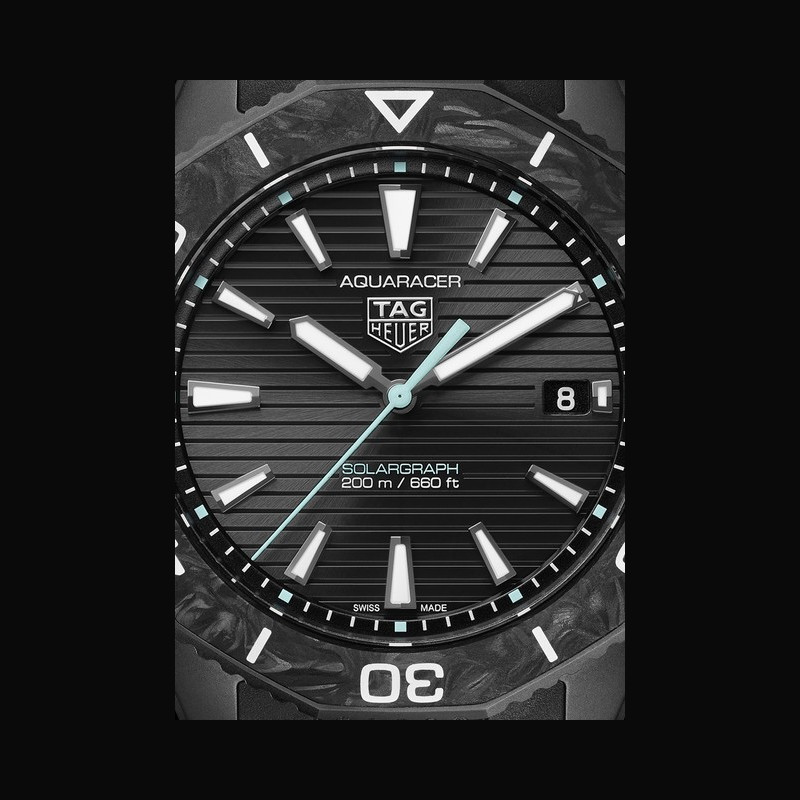 As the sun intensifies any outdoor experience, whether in the desert, fields or the mountains, The TAG Heuer Aquaracer Professional 200 Solargraph embraces it, using the light to illuminate the Super-Luminova® elements of the watch. Thanks to the black indexes, hour and minute hand, and the polar blue lacquered central hands, all covered with Super-Luminova®, the wearers can not only see their watch in pitch dark but can also carry on with the activities of their choice at nighttime.