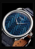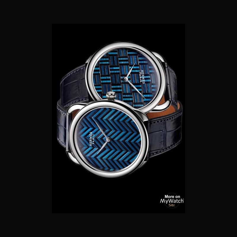 | More characteristics : | Movement H1928 Vaucher Manufacture Mechanical self-winding. made in Switzerland 25.6 mm in diameter (11 ½ lignes) 3.5 mm thick 28.800 vibrations per hour (4 Hz) 55-hour power reserve thanks to series-coupled twin barrels 220 parts 32 jewels Hand-chamfered and polished bridges and mechanisms Dedicated Hermès decorative motif (H symbols) Gold oscillating weight Case White gold (weighing approx. 55 g) Glareproofed sapphire crystal (on one side) both front and back Hermès Paris transfer on the inner side of the crystal Inter-horn width 21 mm Dial Two-tone (pale blue and black) straw marquetry. motif with chevrons Buckle 17 mm white gold pin buckle (weighing approx. 5.75g) Strap Matt indigo blue alligator Dedicated presentation box in Makassar ebony and straw marquetry |