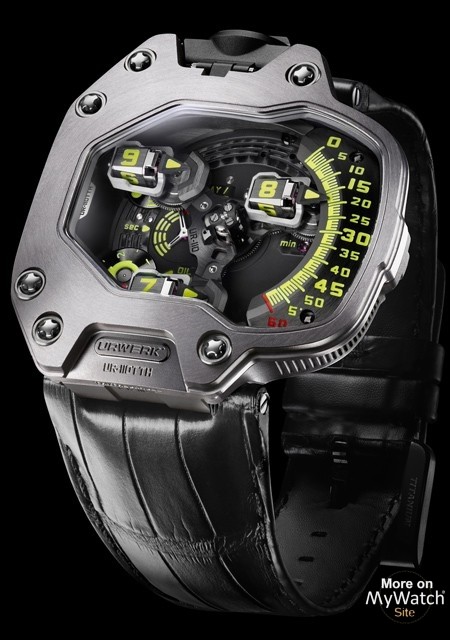| More characteristics : | Satellite complication with rotating hour/minute modules mounted on planetary gears Movement 46 jewels Monometallic balance Flat balance spring Single barrel Frequency : 28 800 vibrations / hour (4 Hz) Power reserve of 39 hours Uni-directional rotor regulated by double turbines 'Oil Change' alerting service intervals Finish : Matting Circular graining Diamond-cuts Grade 5 titanium case Two position crown with integrated protection |
