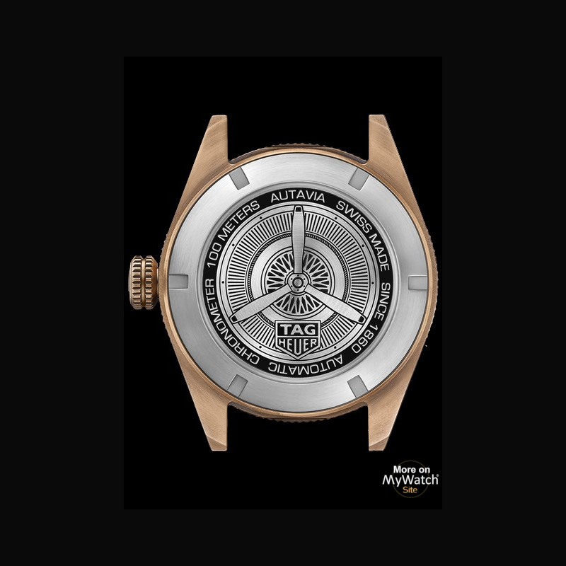 The 42 mm watch features a fumé green or brown dial with a bidirectional rotating ceramic bezel in black or brown, respectively. The brown model is presented on a brown leather strap, while the green model features a khaki-coloured leather strap. A tyre and propeller have been etched into the titanium caseback as a nod to the collection’s rich heritage and the Autavia’s origin: automobile and aviation.