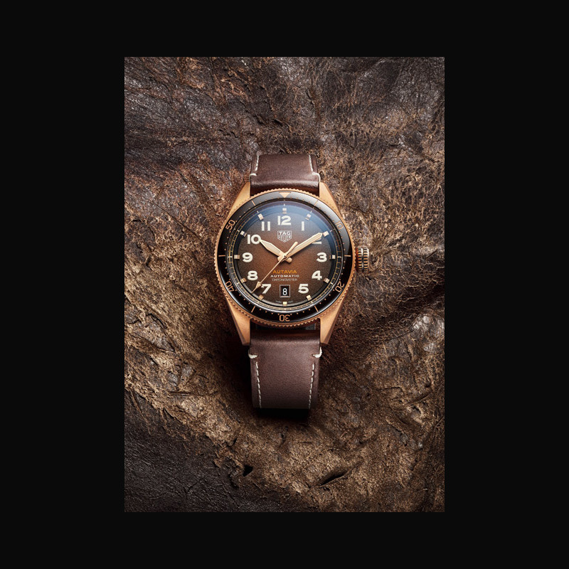 The Autavia in bronze tells a unique story with an ever-changing patina that captures the wearer’s adventures while keeping time with a COSC-certified automatic movement.