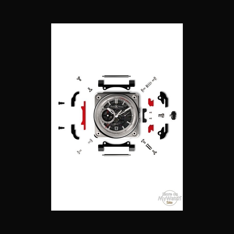 | More characteristics : | Bell & Ross special movement Automatic mechanical Skeleton chronograph Functions : Hours. minutes et small secondes. Skeleton date at 6 o'oclock Chronograph with 60 seconde and 30 minute timers Case Titanium and ceramic with rubber inserts Toggle push-buttons Back with opening in tinted sapphire crystal. centred on the balance Dial Grey-tinted mineral glass Metal skeleton Superluminova filled hours and minutes hands. Applique metal indices with superluminova inserts Straps Woven black rubber Steel pin buckle with rubber insert |