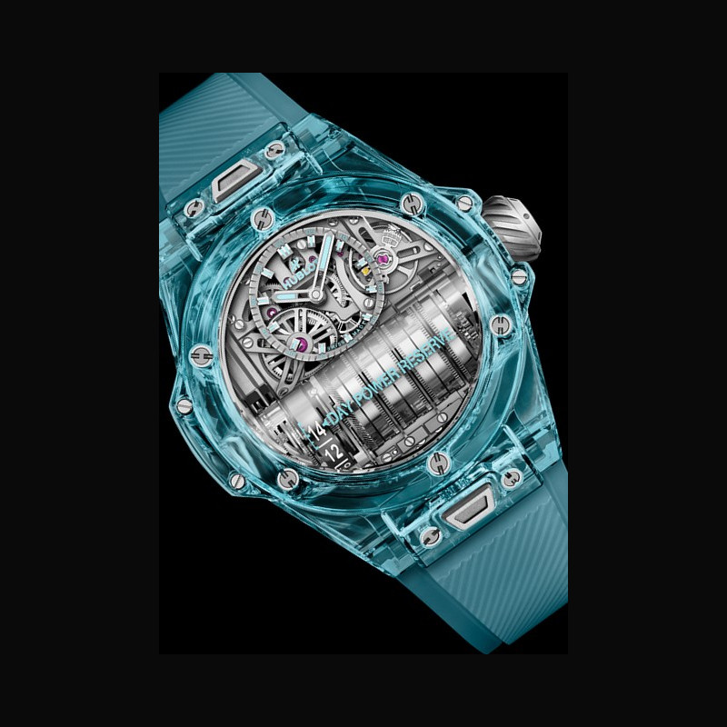 The MP-11 has been the power behind the most daring aesthetic interpretations: ceramic, SAXEM, Magic Gold, 3D carbon. But sapphire remains Hublot's material of choice. The Manufacture is the undisputed master in its use, with probably the widest range of shades in the watch industry. The 2024 edition of the MP-11 is no exception to the long tradition of innovation at the heart of Hublot's DNA. For the first time, it will be available in "Water Blue" sapphire.