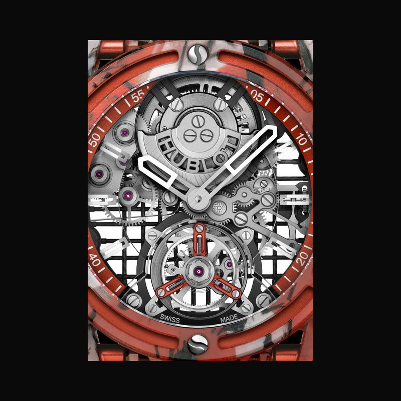Further elegant touches include the mouvement’s aluminium tourbillon cage, which has been anodized in either blue, orange or green to match the case color. At 12 o’clock, the watch’s rhodium-plated, 22-carat red gold micro-rotor is machined and laser-engraved to reveal the Hublot logo. The movement comprises a total of 293 components.