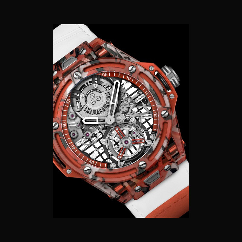 | More characteristics : | Movement HUB6035 Manufacture automatic tourbillon movement Bridges: Transparent sapphire and black-plated Skeleton: Tennis racket string pattern Back Bridges with N. Djokovic’s white printed logo Plate Anthracite ruthenium-plated Micro Rotor 22K Red Gold Skeleton “HUBLOT” Logo Satin- finished and Microblasted Top Finish with Polished Bevel Escapement: Tourbillon escapement Frequency (Hz): 3 (21’600 A/h) Power Reserve: Approx. 72 Hours Number of components: 293 Jewels: 26 Case Orange composite with polos and rackets Dial Sapphire Crystal Strap / Buckles White calfskin with grip tape Pattern leather with orange Velcro®, straps Additional white rubber strap Orange aluminium sport buckle |