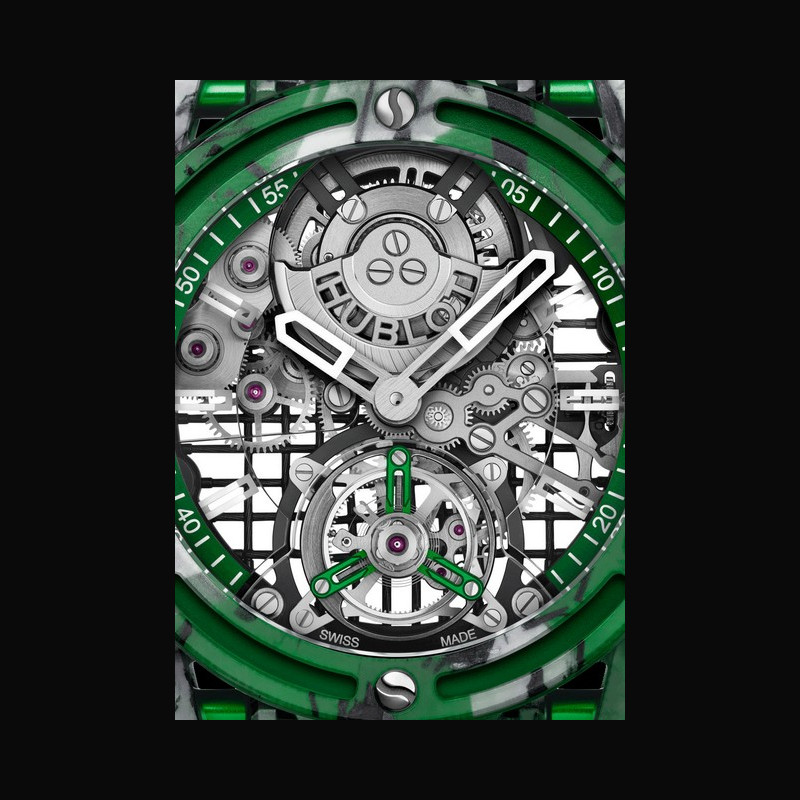 Further elegant touches include the mouvement’s aluminium tourbillon cage, which has been anodized in either blue, orange or green to match the case color. At 12 o’clock, the watch’s rhodium-plated, 22-carat red gold micro-rotor is machined and laser-engraved to reveal the Hublot logo. The movement comprises a total of 293 components.