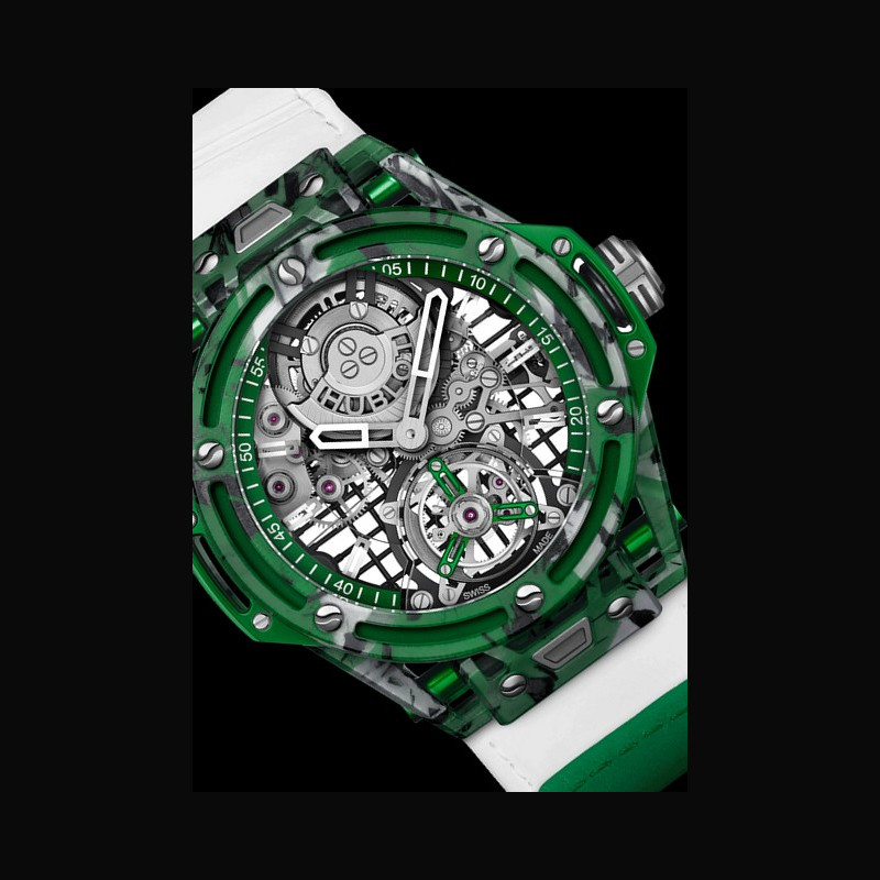 | More characteristics : | Movement HUB6035 Manufacture automatic tourbillon movement Bridges: Transparent sapphire and black-plated Skeleton: Tennis racket string pattern Back Bridges with N. Djokovic’s white printed logo Plate Anthracite ruthenium-plated Micro Rotor 22K Red Gold Skeleton “HUBLOT” Logo Satin- finished and Microblasted Top Finish with Polished Bevel Escapement: Tourbillon escapement Frequency (Hz): 3 (21’600 A/h) Power Reserve: Approx. 72 Hours Number of components: 293 Jewels: 26 Case Green composite with polos and rackets Dial Sapphire Crystal Strap / Buckles White calfskin with grip tape Pattern leather with green Velcro®, straps Additional white rubber strap Green aluminium sport buckle |