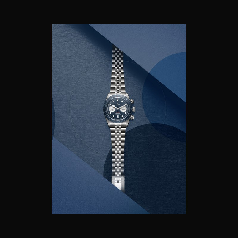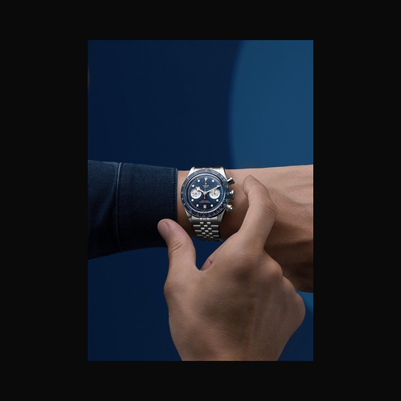 To add another layer of character to the model, this boutique exclusive features a dial that taps into TUDOR’s rich tradition of incorporating blue dials into all the lines of the collection. Throughout the decades, the brand has pioneered several blue hues in a number of designs, always maintaining multiple blue configurations in its successive catalogues. This has led to the notion of "TUDOR Blue", not referring to a specific reference of the colour, rather highlighting its permanence in TUDOR’s characteristic aesthetics. Of particular interest are the two model ranges that inspired the Black Bay Chrono "Blue"—dive watches, like the famed blue "Snowflake" TUDOR Submariner, and chronographs, with the collector- favourite blue "Montecarlo" Oysterdate Chronograph, both models emblematic of seventies TUDOR production.