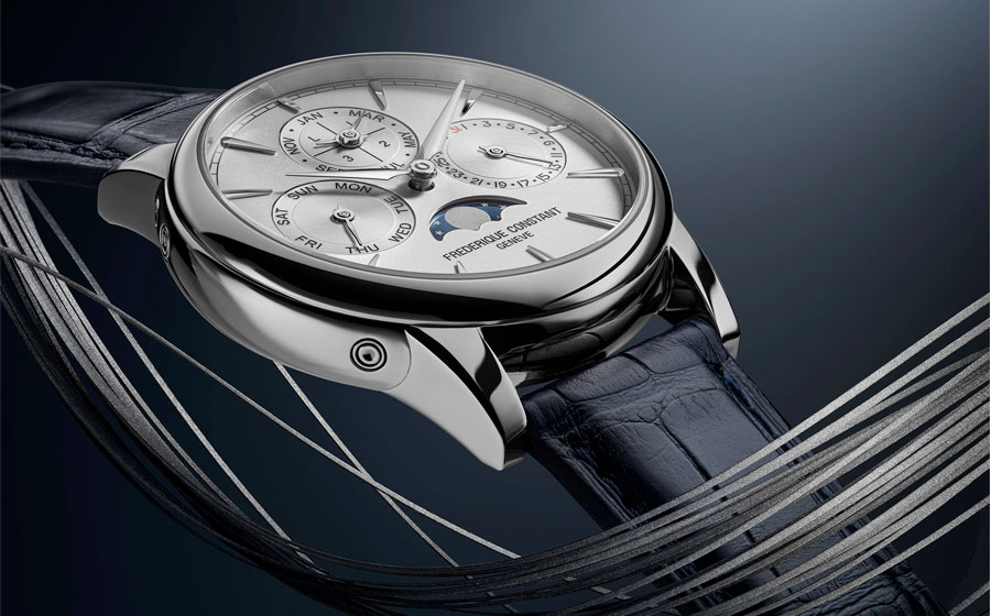 The perpetual calendar translates the irregularities of the Gregorian calendar, adjusting the date (day and month), including leap years. The Frédérique Constant house confirms their mastery of such a complex mechanism, especially with this Classic Perpetual Calendar Manufacture.