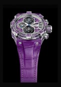 | More characteristics : | Movement Mechanical automatic movement (Valgranges A07.211). COSC-certified Frequency: 28.800 vibrations per hour 25 jewels 48-hour power reserve 18 carat white cold case Dial Complex multiple layers set with 32 baguette-cut amethyst stones 3.3 mm thick sapphire crystal with anti-reflective treatment on both sides |