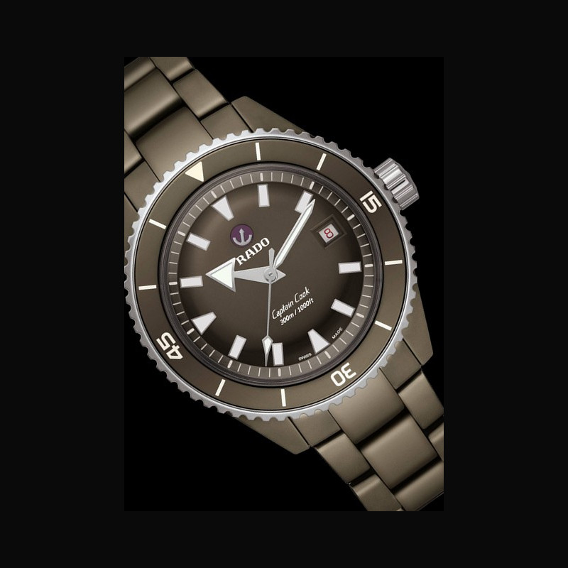 | Display : | Matt applied indexes with white Super-LumiNova® Matt olive green flange with white Super-LumiNova® on every 5 minute track Rhodium coloured moving anchor symbol with synthetic ruby backplate White printed Rado and Captain Cook logos mention of 300m / 1000ft |