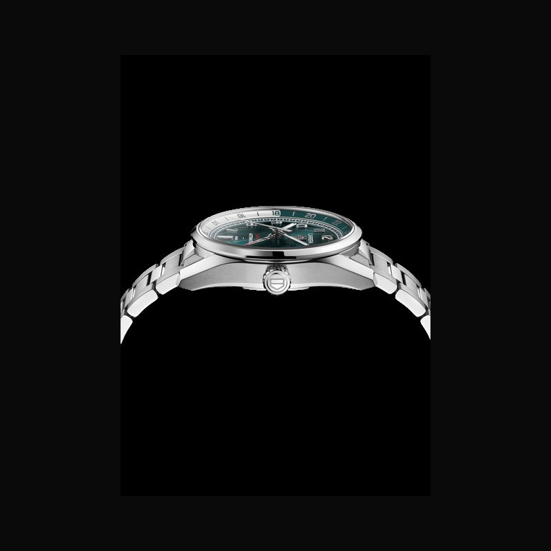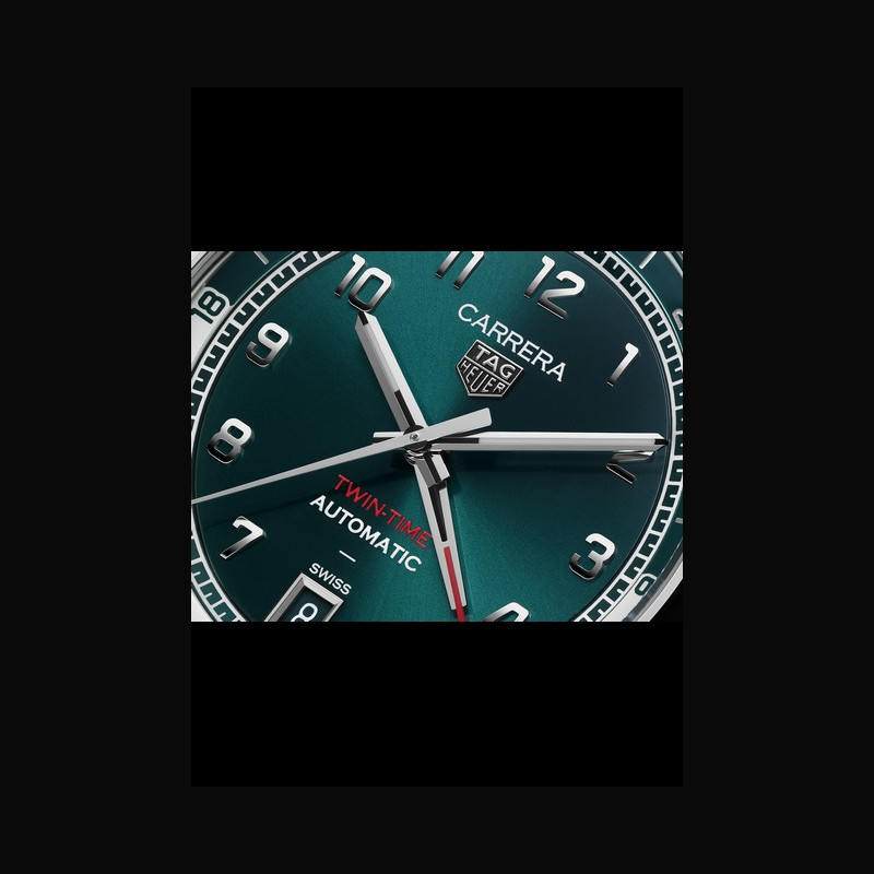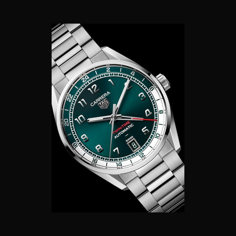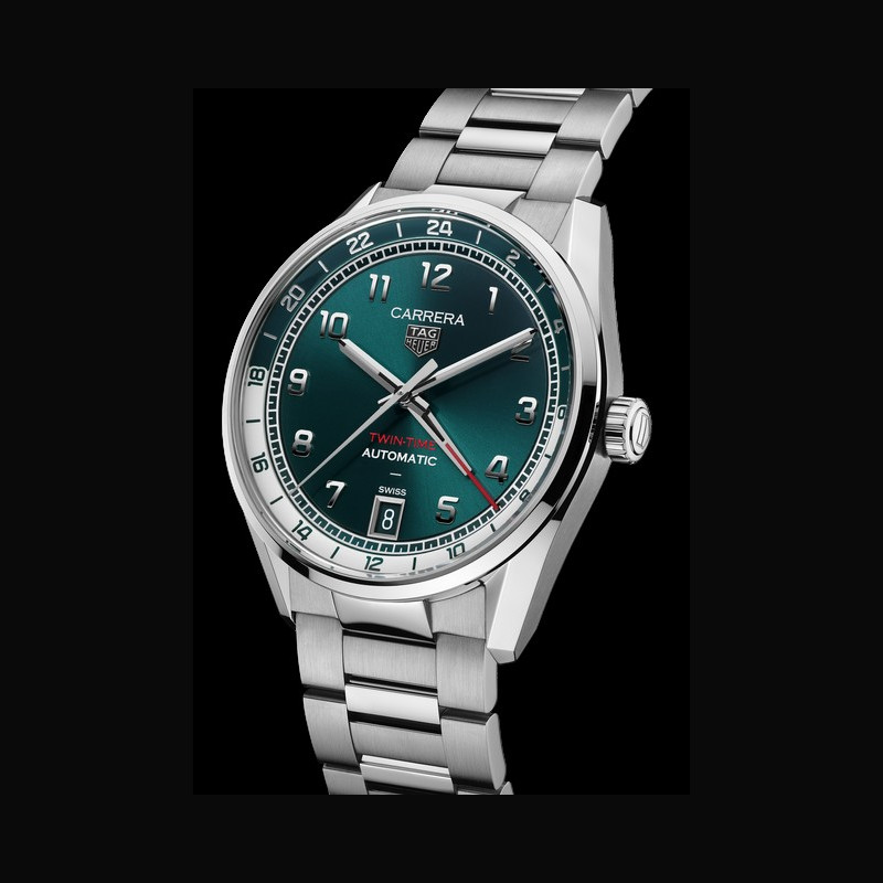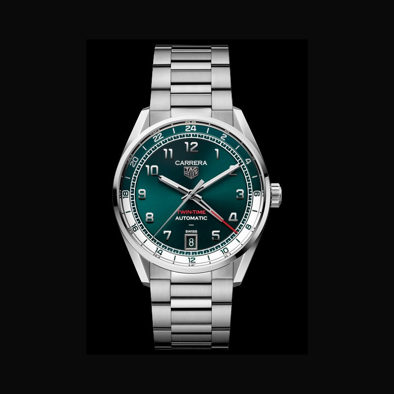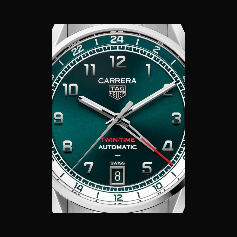 | Display : | Silver teal green color flange with 24 hour scale Rhodium plated faceted; polished applied numerals Rhodium plated faceted; polished hour and minute hands with white Super- LumiNova® Rhodium plated faceted; polished central hand Rhodium plated; polished GMT hand with red lacquered tip Rhodium plated TAG HEUER applied logo 6 o’clock date “CARRERA” “TWIN TIME” “AUTOMATIC” “SWISS” printed |