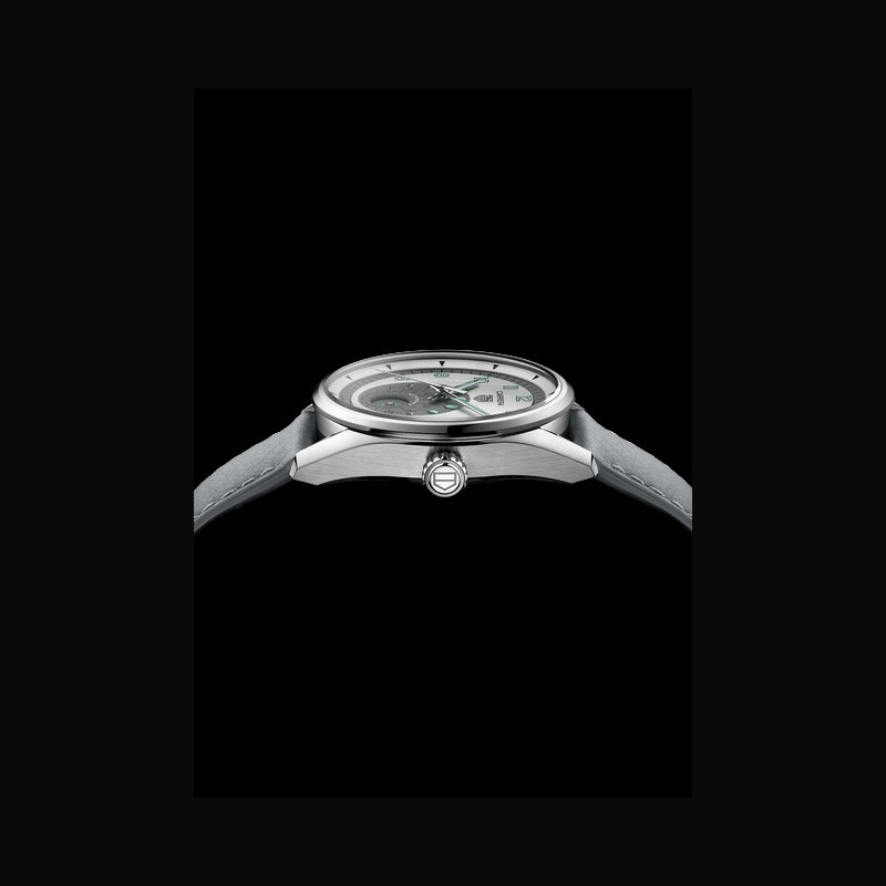 | More characteristics : | Movement Caliber 7 Case Steel polished case Lug-to-lug: 45.2mm Dial Silver sunray brushed dial Strap / Buckles Grey leather strap Steel fine brushed, polished double folding clasp with double safety push-buttons; TAG Heuer applied shield Availability October 2025 |