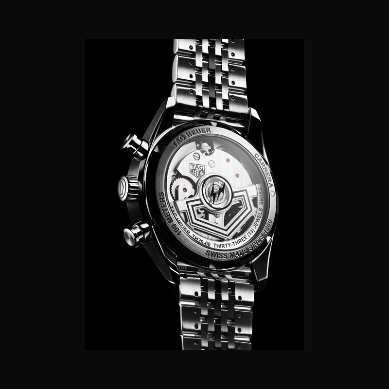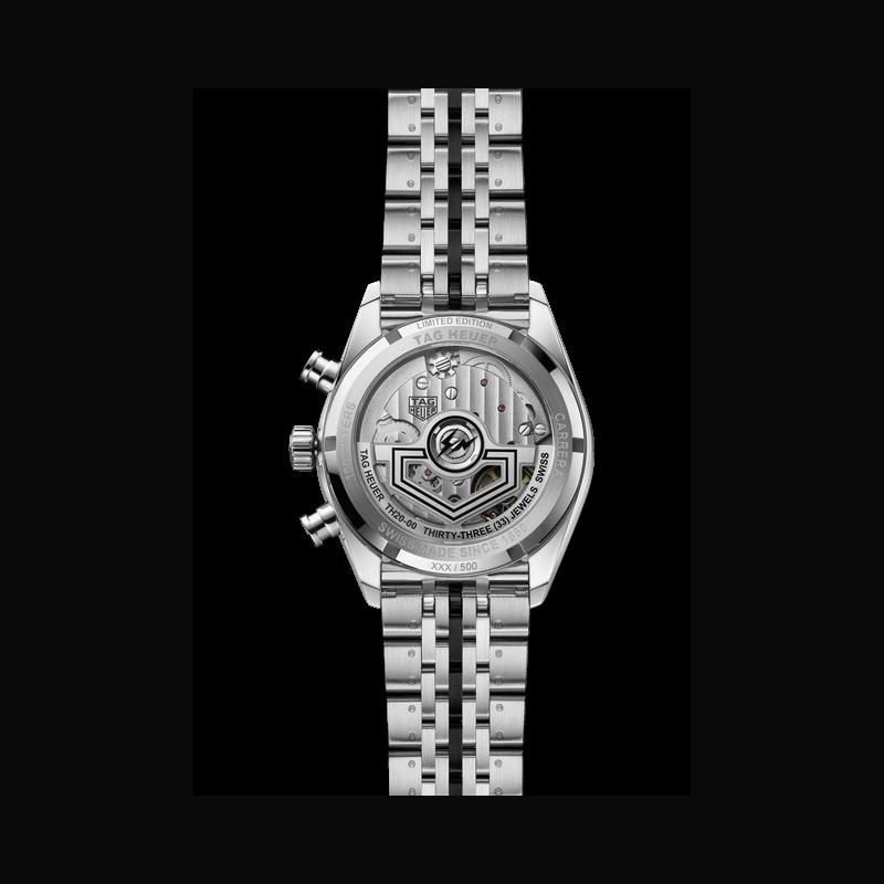 Around the caseback edge, the engraved Victory Wreath references the golden age of Formula 1®. Inspired by Jack Heuer’s tradition of gifting gold watches that were seen as lucky charms to talented, victorious drivers, the Victory Wreath engraving became a symbol of that success.