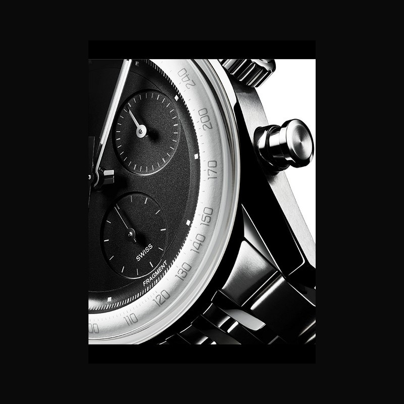 The chronograph hands are rhodium-plated. The tachymeter scale has been tuned as well, using a lighter grey on the bezel, another design direction by Fujiwara.