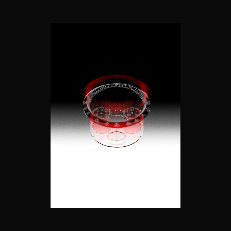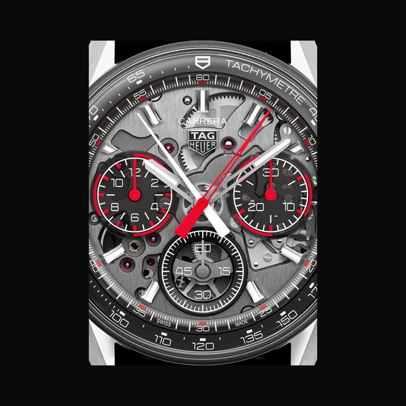 Featuring a tachymeter scale, the flange is curved to follow the profile of the crystal, minimising parallax error, and the translucent sapphire glass dial allows for the exceptional finishing of the movement to be clearly visible. Further conveying the key code of transparency in the Avant-Garde Horlogerie timepieces of TAG Heuer, the subsidiary dials are individually constructed from the same material as the main dial, providing the watch with enhanced depth.