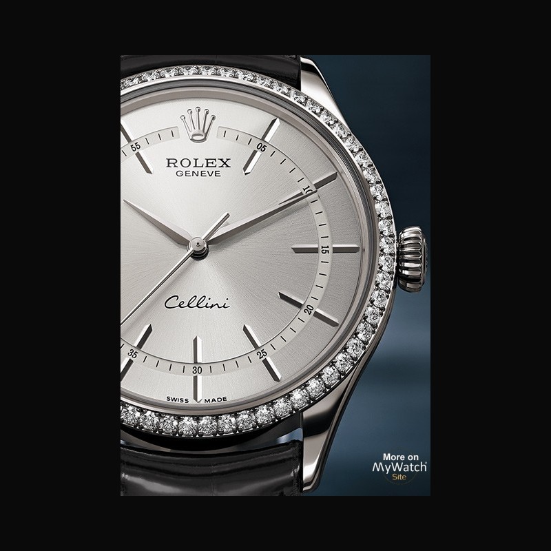 The new gem-set Cellini Time models are offered in 18 ct white or Everose gold with a 39 mm case and a single or double bezel set with diamonds. The double bezel combines a row of 96 diamonds with the fluting emblematic of Rolex watches. Its black lacquer dial is accentuated by 11 diamonds at the tip of the hour markers. The versions with a single bezel set with 62 diamonds feature new pink or rhodium dials with a sunray finish and elongated applique hour markers. The new gem-set Cellini Time is fitted on a remborded and stitched alligator leather strap in semi-matt black with an 18 ct gold buckle matching the gold of the case.