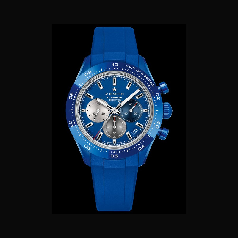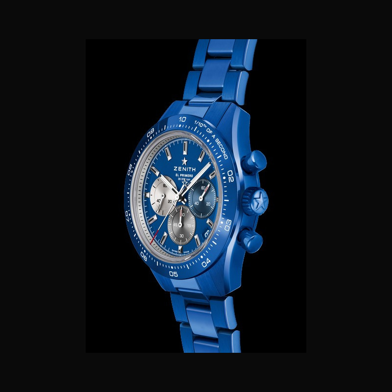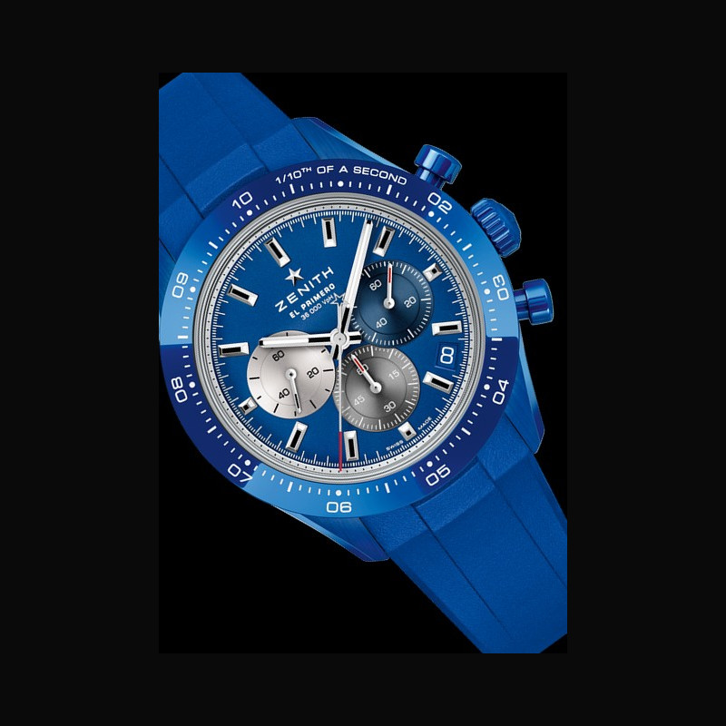 + More characteristics : | Movement Movement: El Primero 3600 automatic Frequency: 36,000 VpH (5 Hz) Power reserve: 60 hours Case Blue ceramic Dial Blue-tones lacquered with three different-coloured counters Bracelet / Buckles Comes with 2 straps: Blue ceramic bracelet with ceramic folding clasp and blue rubber strap with steel folding clasp |