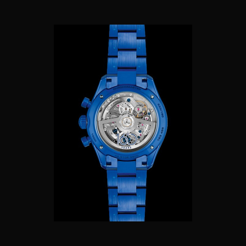 The CHRONOMASTER Sport 160th anniversary edition comes with two straps: a blue ceramic bracelet with a ceramic folding clasp and a blue rubber strap with a steel folding clasp.