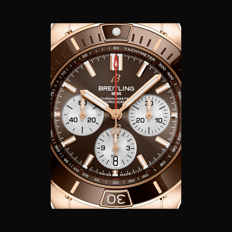 | More characteristics : | Movement Caliber: Breitling Manufacture Caliber 01 Diameter: 30 millimeters Depth: 7.2 millimeters Winder: self-winding mechanical, bidirectional with ball bearing Power reserve: approximately 70 hours Number of components: 346 Balance frequency: 28,800 a/h or 4 hertz Chronograph: column-wheel, vertical clutch, 1/4th second, 30-minute and 12-hour counters Case 18 k red gold Dial Brown with silver contrasting chronograph counters Bracelet / Buckles 18 k red gold Rouleaux bracelet with butterfly clasp |