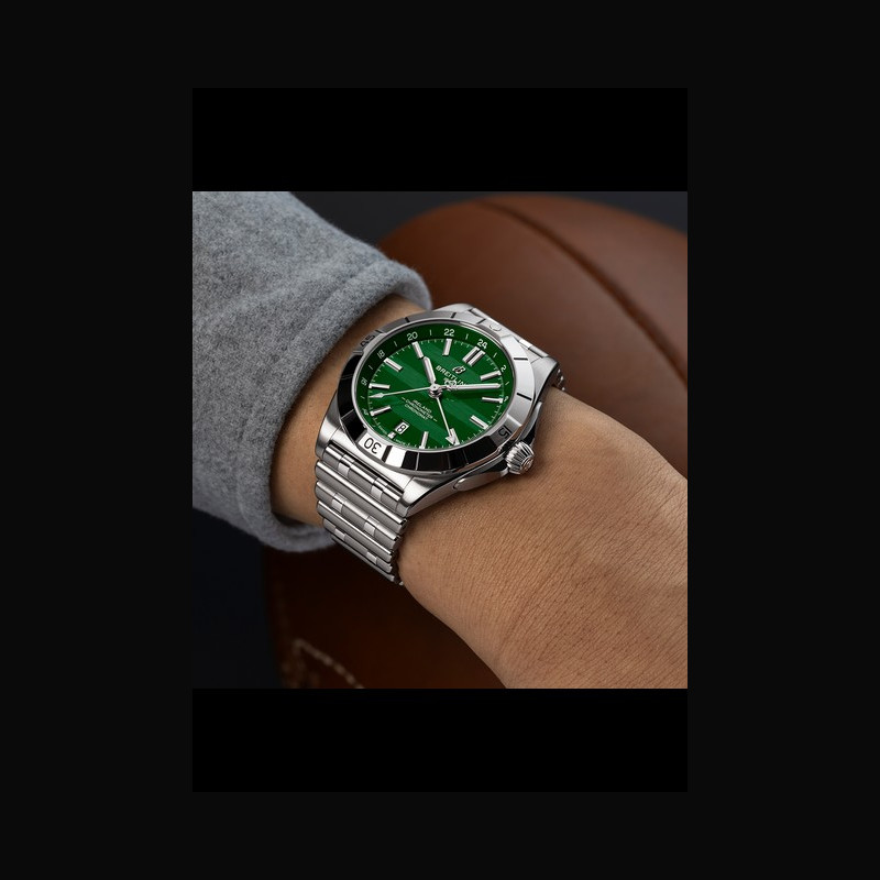 | More characteristics : | Movement Caliber: Breitling Caliber 32 Diameter: 25.6 millimeters Depth: 4.1 millimeters Winder: self-winding mechanical, bidirectional with ball bearing Power reserve: approx. 42 hours Balance frequency: 28,800 a/h or 4 hertz Certification: COSC-certified Case Stainless Steel Height (upper lug tip to lower lug tip): 47.4 millimeters Dial Green Bracelet / Buckles Stainless-steel Rouleaux bracelet with butterfly clasp |
