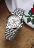 Each team’s watch features a textured dial with alternating matte and horizontal brushed finishes, inspired by the stripes of the rugby field. The dynamic dial design creates a striking play of light reflecting the grit and elegance of rugby both on and off the field.