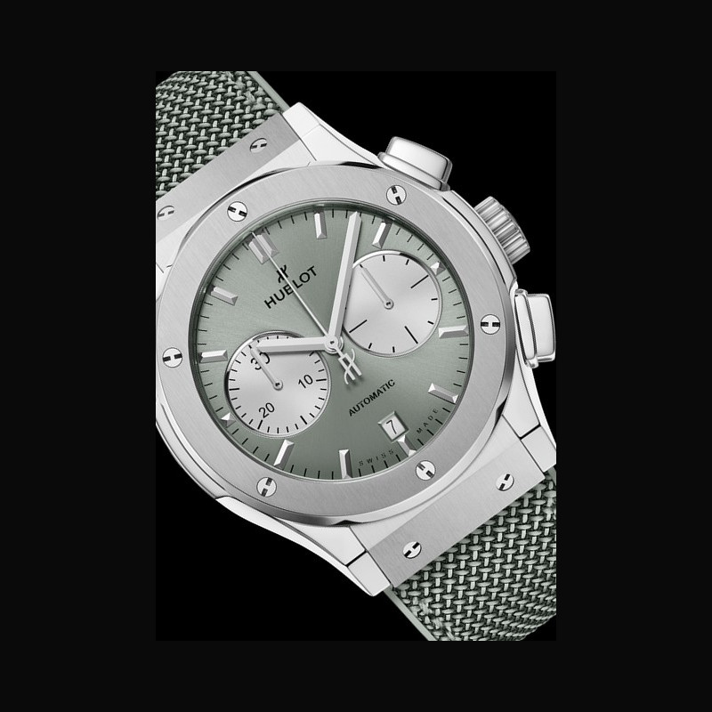 | More characteristics : | Movement HUB1143 Self-winding chronograph movement Date: window at 6.00 Number of components: 280 Jewels: 59 Frequency (Hz): 4 (28,800 alt/h) Power reserve: approx. 48 hours Case Satin-finished and polished titanium Dial Satin-finished Sage Green sunray Strap / Buckles Sage Green rubber with Sage Green fabric Stainless steel deployant buckle clasp |