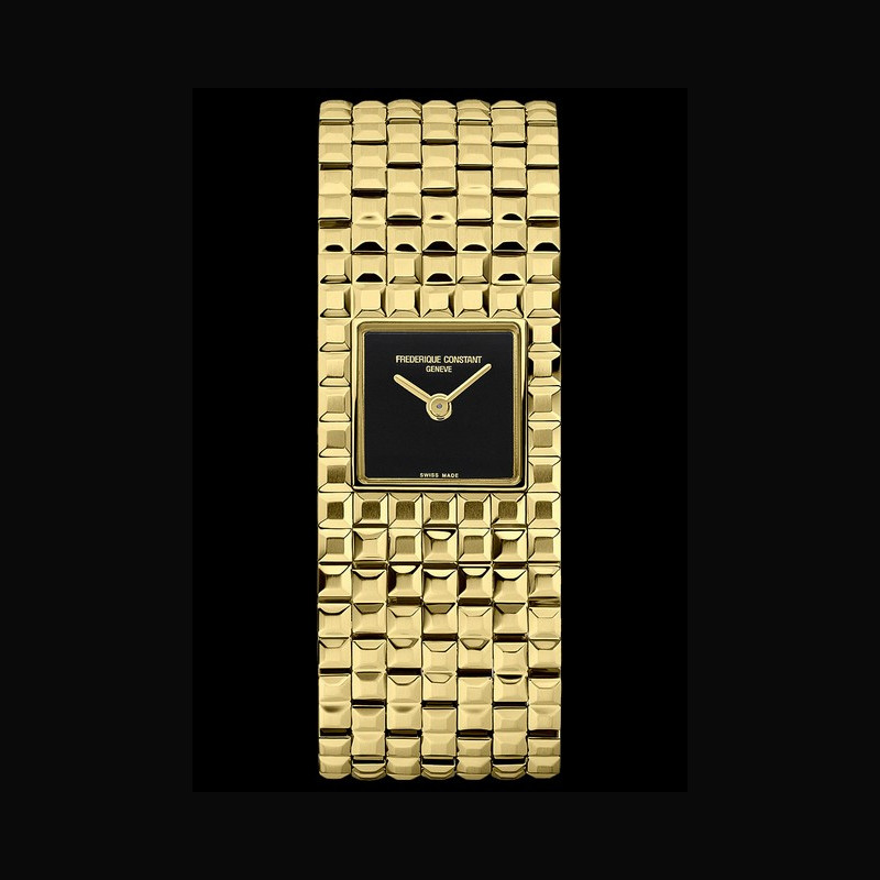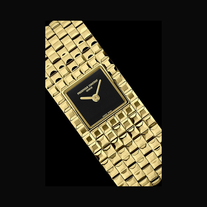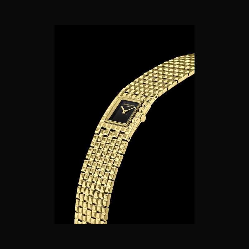 | + More characteristics : | Movement Caliber FC-200, quartz 60-month battery life, 4 jewels Case Two-part polished stainless steel Dial Black onyx Bracelet / Boucles 7-link stainless steel bracelet with brushed and polished gold Clous-de-Paris pattern Folding clasp |