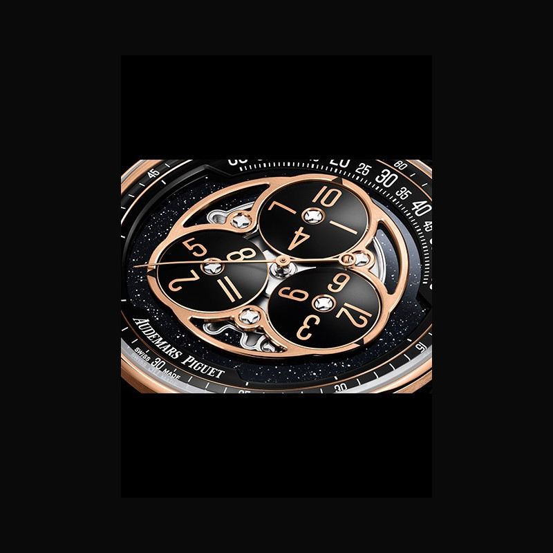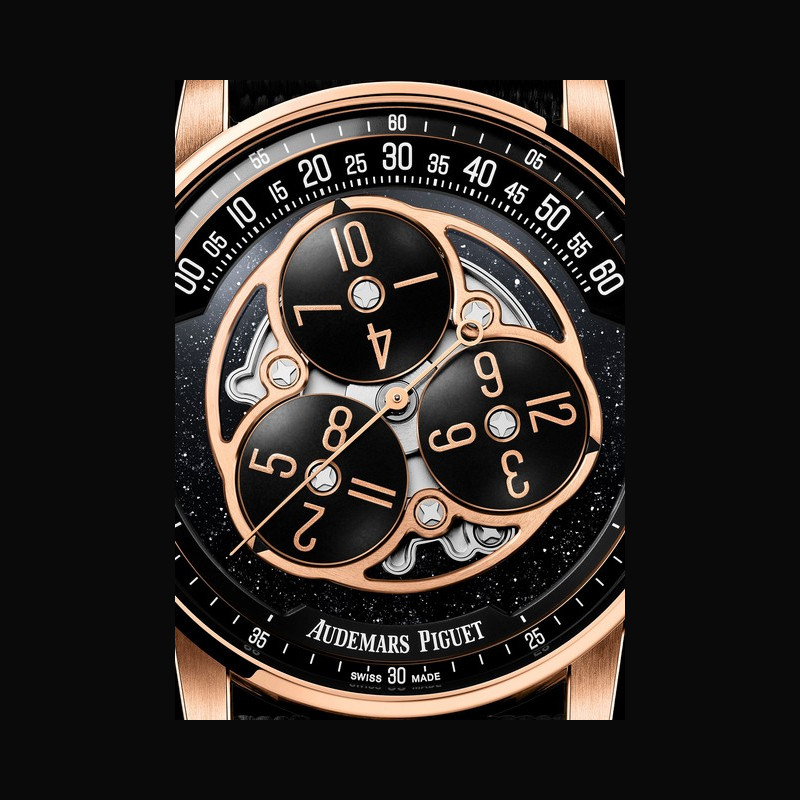 This latest 41 mm variation combines an 18-carat pink gold bezel and caseback with a black ceramic case middle, highlighting the contemporary architecture of the Code 11.59 by Audemars Piguet case. The contrast of materials and colours extends to the dial, where the black aventurine plate provides a shimmering backdrop for the wandering hours display. e
