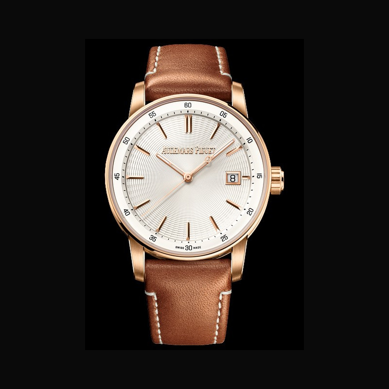 | More characteristics : | Movement Selfwinding Calibre 5900 Total diameter 26.2 mm (11½ lignes) Total thickness 3,9 mm Number of parts 188 Number of jewels 29 Minimum guaranteed power reserve 60 h Frequency of balance wheel 4 Hz (28,800 vibrations/hour) Case 18-carat pink gold case Dial Silver dial with signature Code 11.59 by Audemars Piguet motif Strap / Buckles Brown calfskin leather strap with 18-carat pink gold pin-buckle |