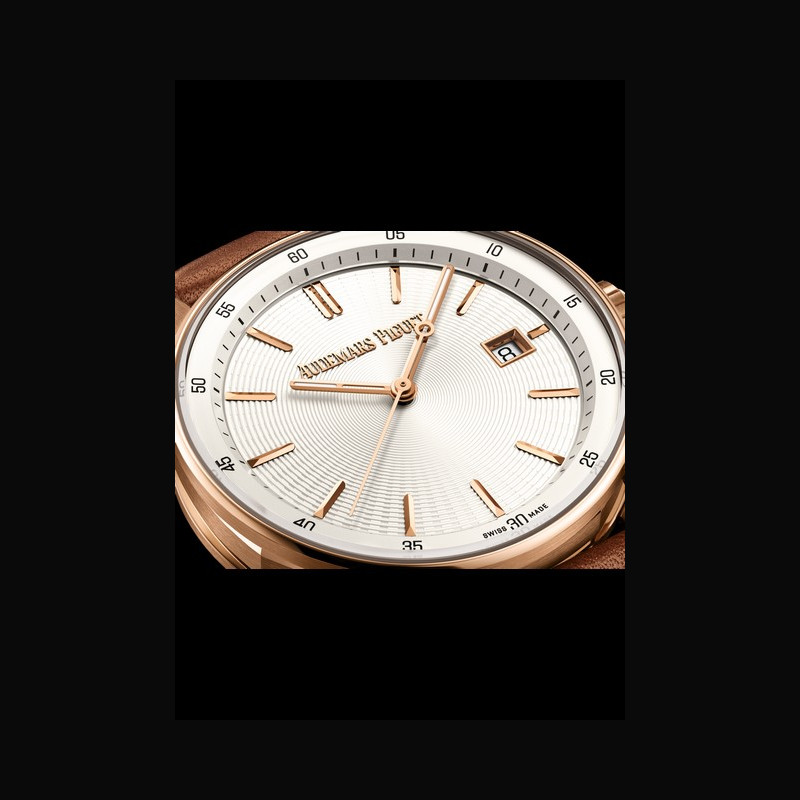 | + More characteristics : | Movement Selfwinding Calibre 5900 Total diameter 26.2 mm (11½ lignes) Total thickness 3,9 mm Number of parts 188 Number of jewels 29 Minimum guaranteed power reserve 60 h Frequency of balance wheel 4 Hz (28,800 vibrations/hour) Case 18-carat pink gold case Dial Silver dial with signature Code 11.59 by Audemars Piguet motif Strap / Buckles Brown calfskin leather strap with 18-carat pink gold pin-buckle |