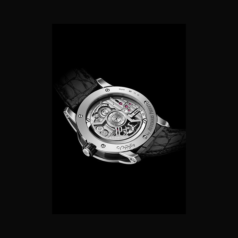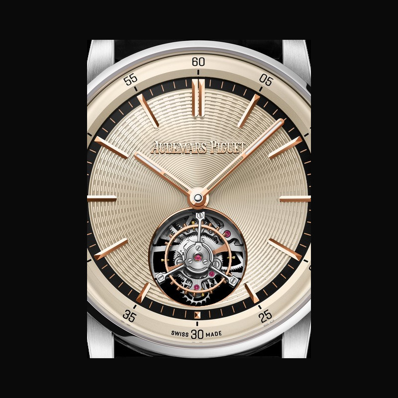 Encased in 18-carat white gold with a black ceramic case middle, this latest model introduces an elegant ivory-toned dial adorned with the collection’s signature pattern, which was first revealed in 2023. Developed in collaboration with Swiss guilloché artisan Yann von Kaenel, the dial features concentric circles engraved and punctuated by hand and enhanced through PVD colouring, creating a mesmerizing interplay of depth and light. Powered by selfwinding Calibre 2950, the watch showcases a flying tourbillon at 6 o’clock – visible both on the dial and through the sapphire caseback. This mechanism, which first appeared in the Royal Oak Concept collection in 2018 and debuted in Code 11.59 by Audemars Piguet in 2019, rotates without an upper bridge, offering an unobstructed view of the regulating components.