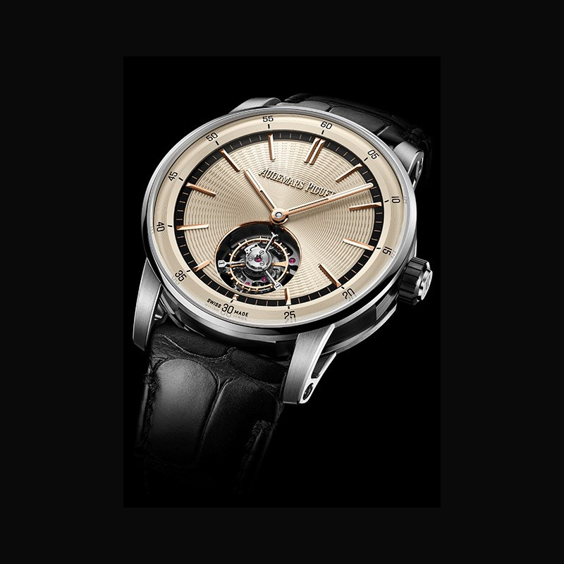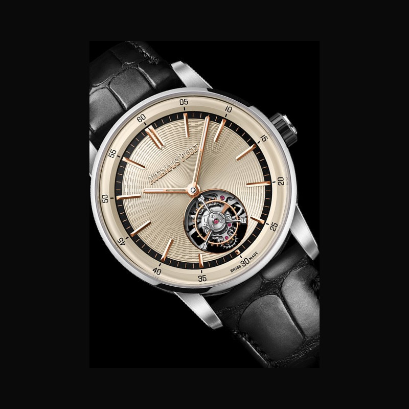 The ivory inner bezel complements the dial’s elegance, which sits in bold contrast to a black external perimeter encircling the dial, echoing the ceramic middle case and black alligator strap. Touches of 18-carat pink gold tones complete the look, including on the hands, hour-markers and outer rim of the flying tourbillon aperture. This new version of the Code 11.59 by Audemars Piguet blends technical sophistication with artisanal finesse, reaffirming the Manufacture’s commitment to pushing the boundaries of contemporary watchmaking.