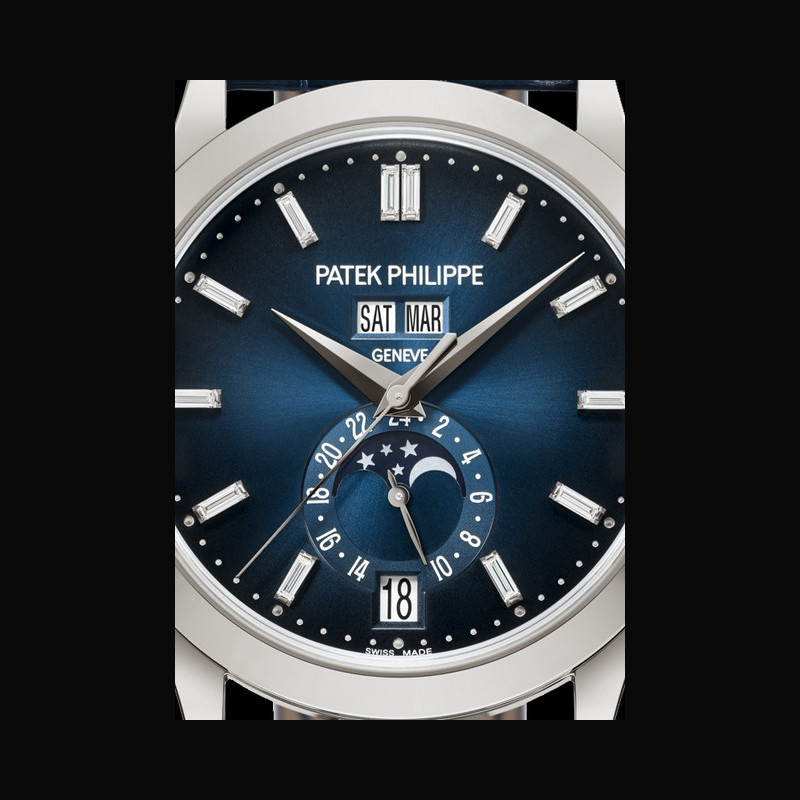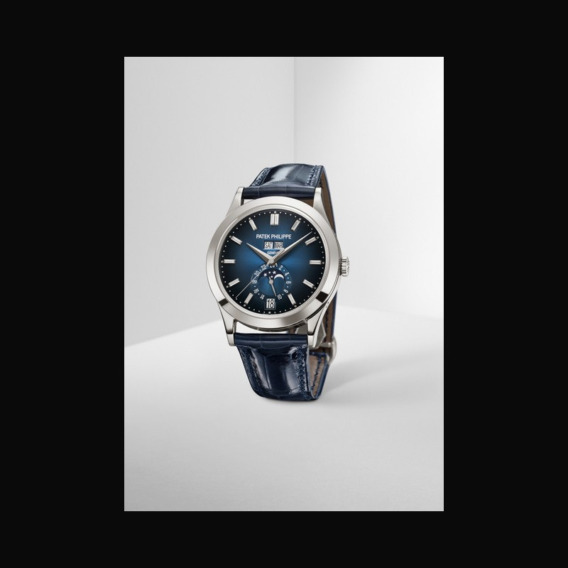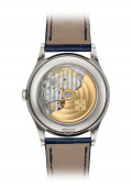 With its double day/month aperture at 12 o’clock and date aperture at 6 o’clock and its subsidiary 24- hour dial incorporating a moon-phase display, the men’s Annual Calendar Reference 5396, launched in 2006, has established itself as a firm favorite. Patek Philippe is now bringing out a new version in white gold featuring a blue sunburst dial with a black gradient at the rim lit discreetly by the radiance of twelve baguette-cut diamond hour markers (0.26 ct). This elegant contrast plays up the extreme restraint and legibility of the dial design, with its facetted dauphine-style hands in white gold and slender sweep seconds hand. An alligator-leather strap in shiny navy blue echoes the dial color. It is secured by a fold- over clasp in white gold. This new Annual Calendar Reference 5396G-017 houses the caliber 26-330 S QA LU 24H self-winding movement.