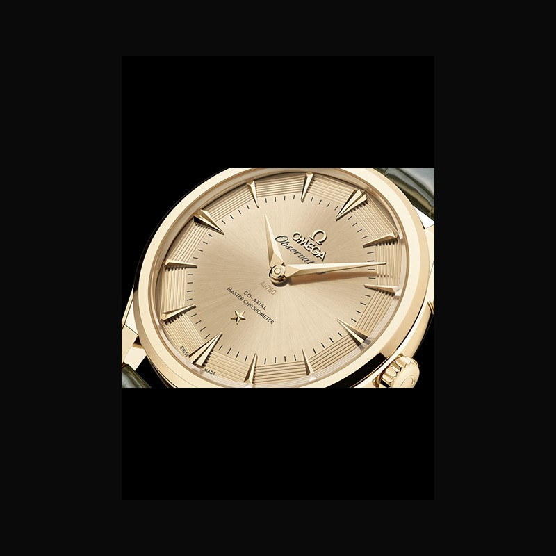 Calibre 8915 Luxe movements are designed for the 18K gold collection, including the first use of an 18K Moonshine™ Gold rotor and balance bridge in OMEGA’s history, in addition to the usual 18K Sedna™ Gold. The rotor base bears the Geneva waves in arabesque with horizontally brushed outer zone. The medallion is in 18K corresponding gold with laser-ablated elements, contrasting mat and polished finishes.