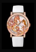 | More characteristics : | Girard-Perregaux GP 4000 manufacture caliber with additional «Crazy Seconds» module 18-carat pink gold case set with diamonds and multicoloured sapphires Caseback with an elliptical sapphire glass Dial White mother-of-pearl and petrified palm tree marquetry set with multicolored sapphires. diamonds. garnets and onyx White brushed satin strap |