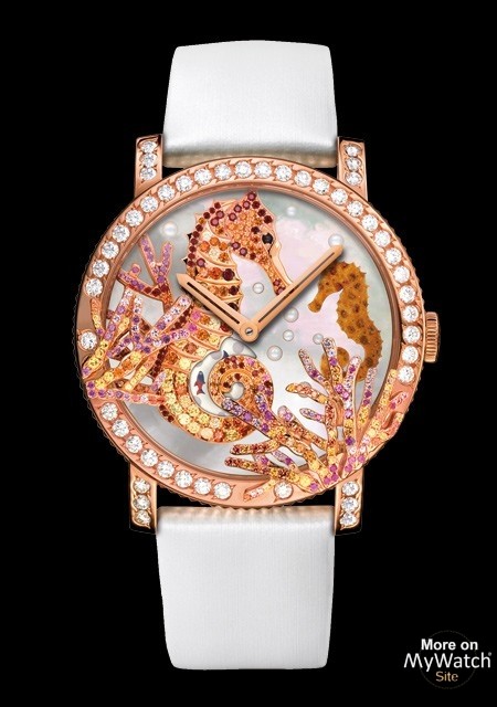 | Dial : | Marquetry Set with diamonds Set with sapphires Set with garnets White mother-of pearl Pink gold Serti d'onyx |