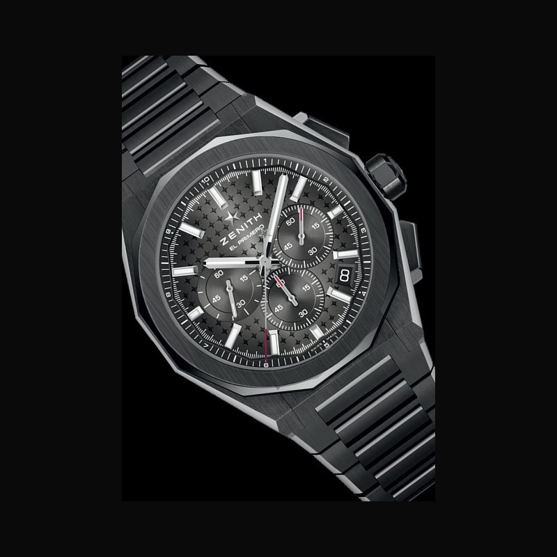 | More characteristics : | Movement Movement: El Primero 3600 automatic Frequency: 36,000 VpH (5 Hz) Power reserve: 60 hours Automatic El Primero column-wheel chronograph able to measure and display 1/10th of a second Date indication Silicon escape wheel and lever Case Black ceramic Dial Gradient grey starry sky pattern Bracelet / Buckles Black ceramic bracelet with double folding clasp, and black rubber strap with steel folding clasp |