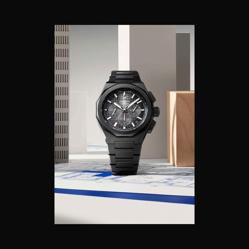 The DEFY Skyline Chronograph returns in a striking new interpretation, now crafted entirely in black ceramic. First presented in full ceramic within a trio of blue-toned editions created to mark the Manufacture’s 160th anniversary in 2025, the model now takes on a bold and distinctly contemporary presence in deep black, a material and colour that amplify both its architectural silhouette and refined urban character.