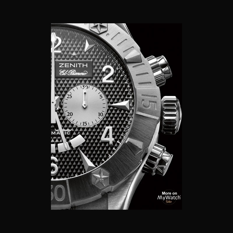 | More characteristics : | Movement 13``` caliber Diameter : 30 mm Height : 7.75 mm 248 components 39 jewels Frequency : 36’000 vibrations per hour Balance bridge in shock-absorbing Zenithium Z+ Incabloc ® anti-shock device Power reserve over 50 hours Measures short time intervals to a 10th of a second Automatic winding in both directions Central rotor on ball bearings Full tungsten oscillating weight with guilloché pattern Screw-in push buttons with specific guilloche pattern Screw-in crown engraved with ZENITH star Graduated unidirectional rotating bezel. with stainless steel decorative screw-heads & satin-finished cone-shaped indexes |