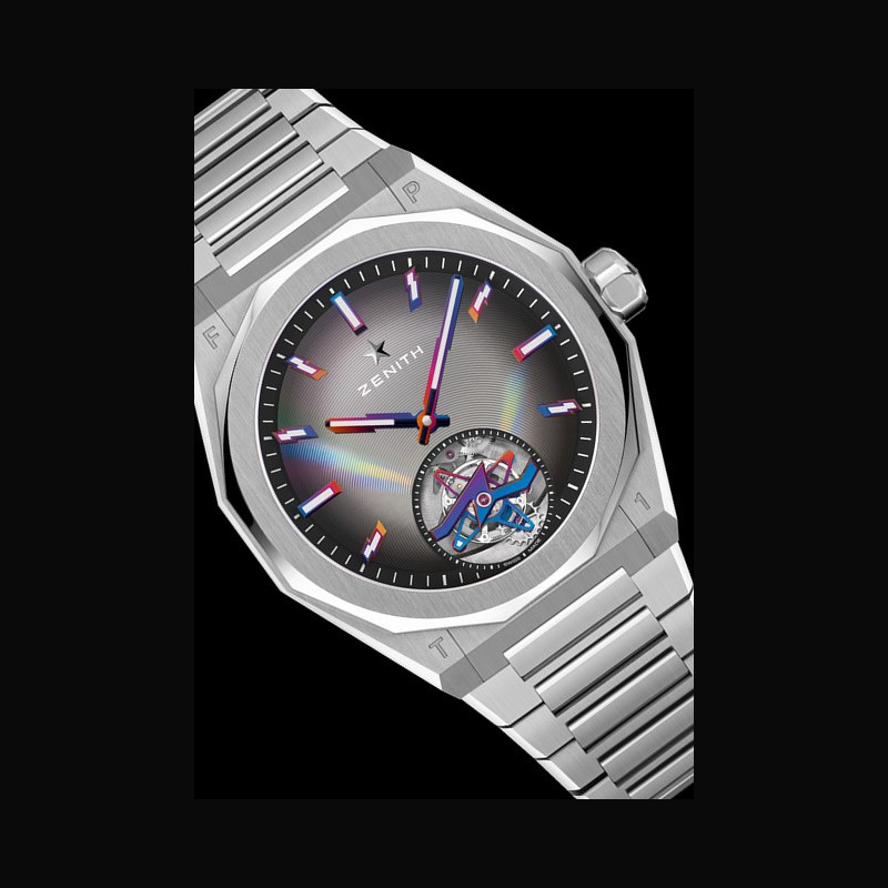 On the latest chapter of the artist’s creative output with ZENITH, Felipe Pantone shared, “I'm excited to unveil my latest collaboration with Zenith, our most exceptional watch to date. It's a masterpiece of high horology, combining simplicity and sophistication. This complex yet minimalist timepiece features stunning details, including the tiny gradient indexes and hands, the mirror ‘Planned Iridescence’ dial and a truly unique bolt shaped tourbillon.”