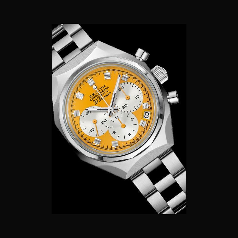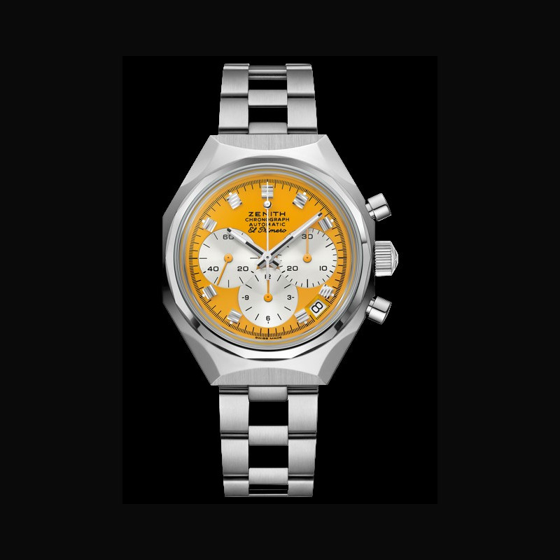 More characteristics : | Movement Movement: El Primero 400 Frequency: 36,000 VpH (5 Hz) Power reserve: 55 hours Case Stainless Steel Dial USM Golden Yellow Bracelet / Buckles Stainless steel “ladder” bracelet |
